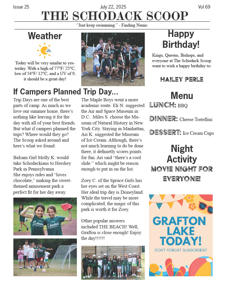 This week, our Waiters hit the road for a basketball game at Camp Greylock, bringing strong effort and great energy to the court. Our Super Senior girls competed in a soccer tournament at Camp Lenox, showing grit and teamwork throughout the day. Over at Camp Pontiac, our 5th and 6th grade girls made an impressive run to the soccer semifinals, playing their hearts out in each match. We also sent a group to Camp Scatico for a chess tournament, where Tate Shalov reached the semifinals and Nathan Peled battled his way to the finals. And our 1st Year CITs represented Schodack in a volleyball intercamp at Scatico, playing hard and showing amazing spirit on the court. Another awesome week for Schodack all around!