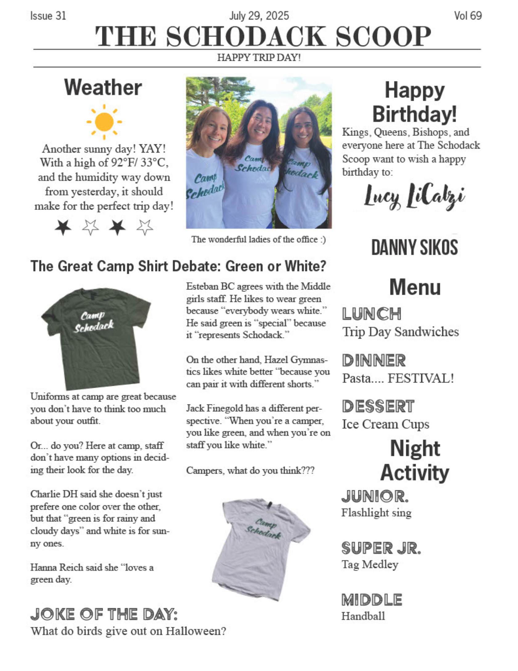 Thursday we had our special event afternoon with the Magen Boys making a return, leading dances, handing out shirts and other swag, and we were all very happy they were back. The Kona Ice Truck made an entrance which was a camp classic we were excited to have again. We ended the day with SPEC viewing practicing our BPNs and getting ready for the last leg of triple crown coming up this weekend.